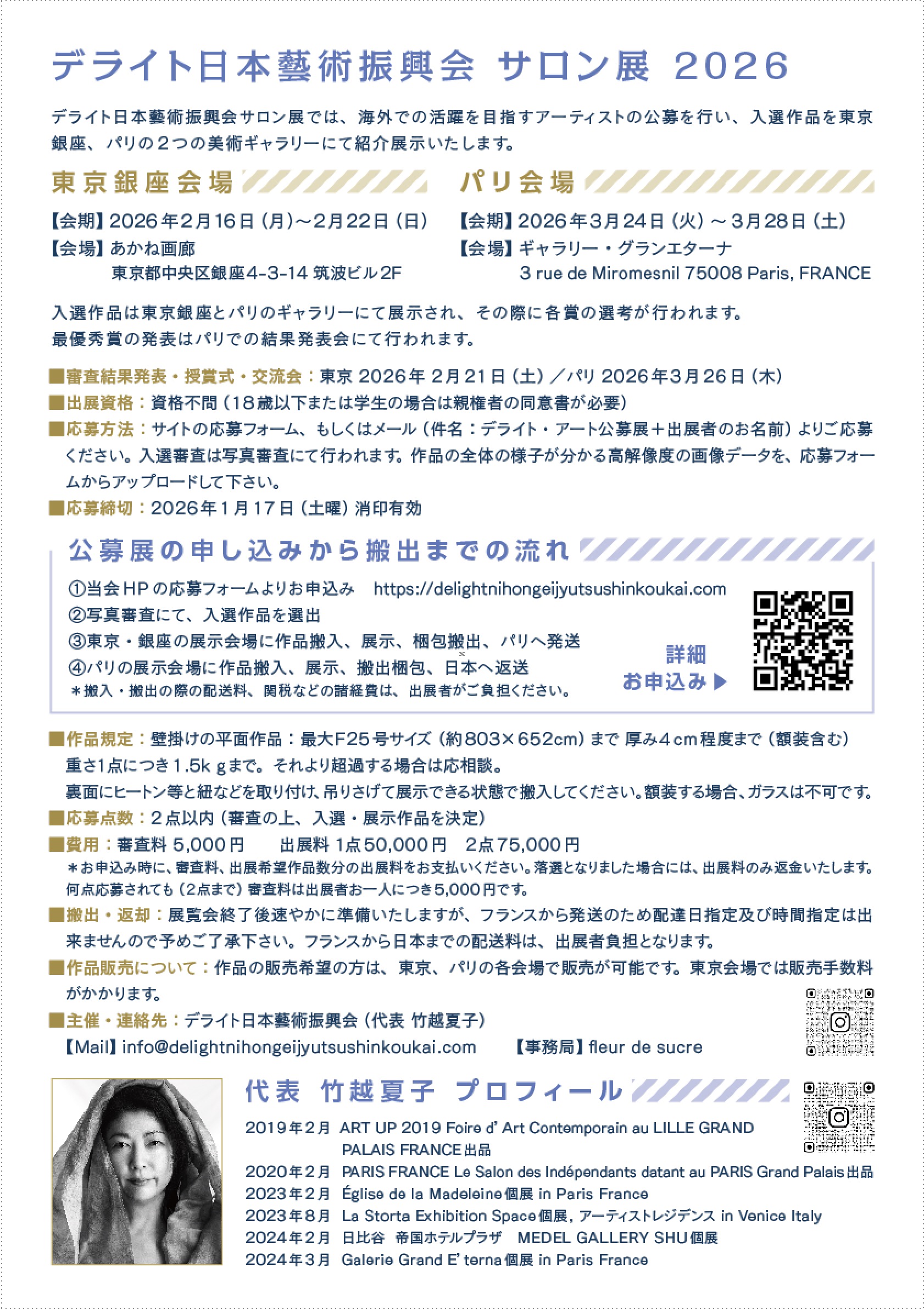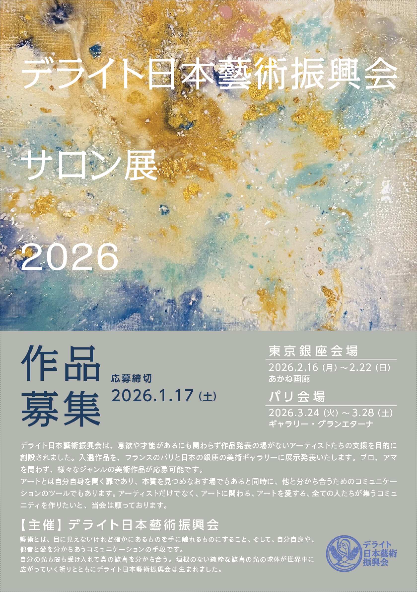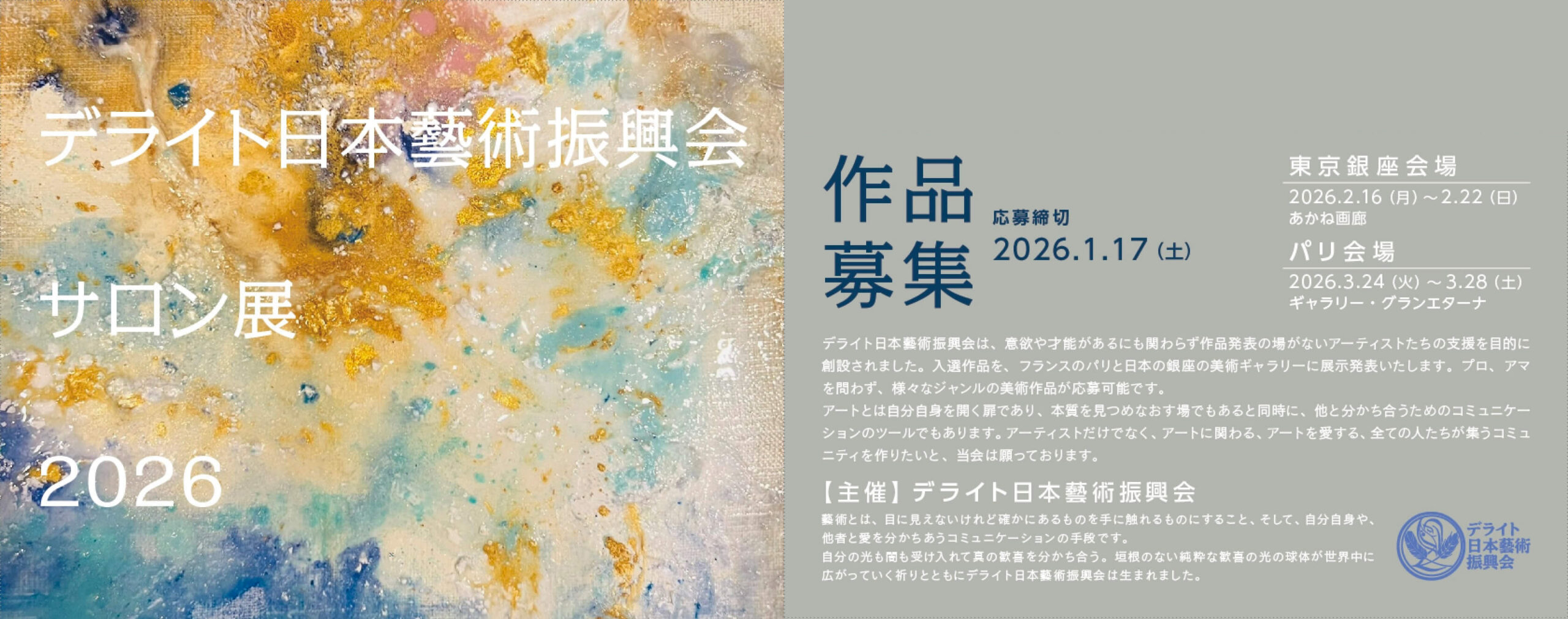 - 第二回デライト日本藝術振興会 サロン展2026募集開始しました。2026年1月17日締め切りです。 サロン展2026 公募規約詳細はこちら
